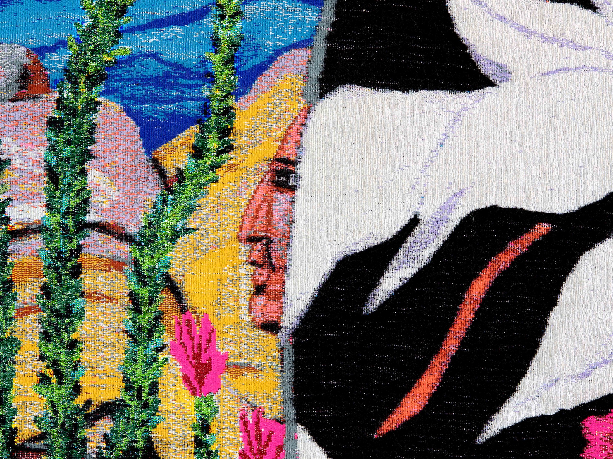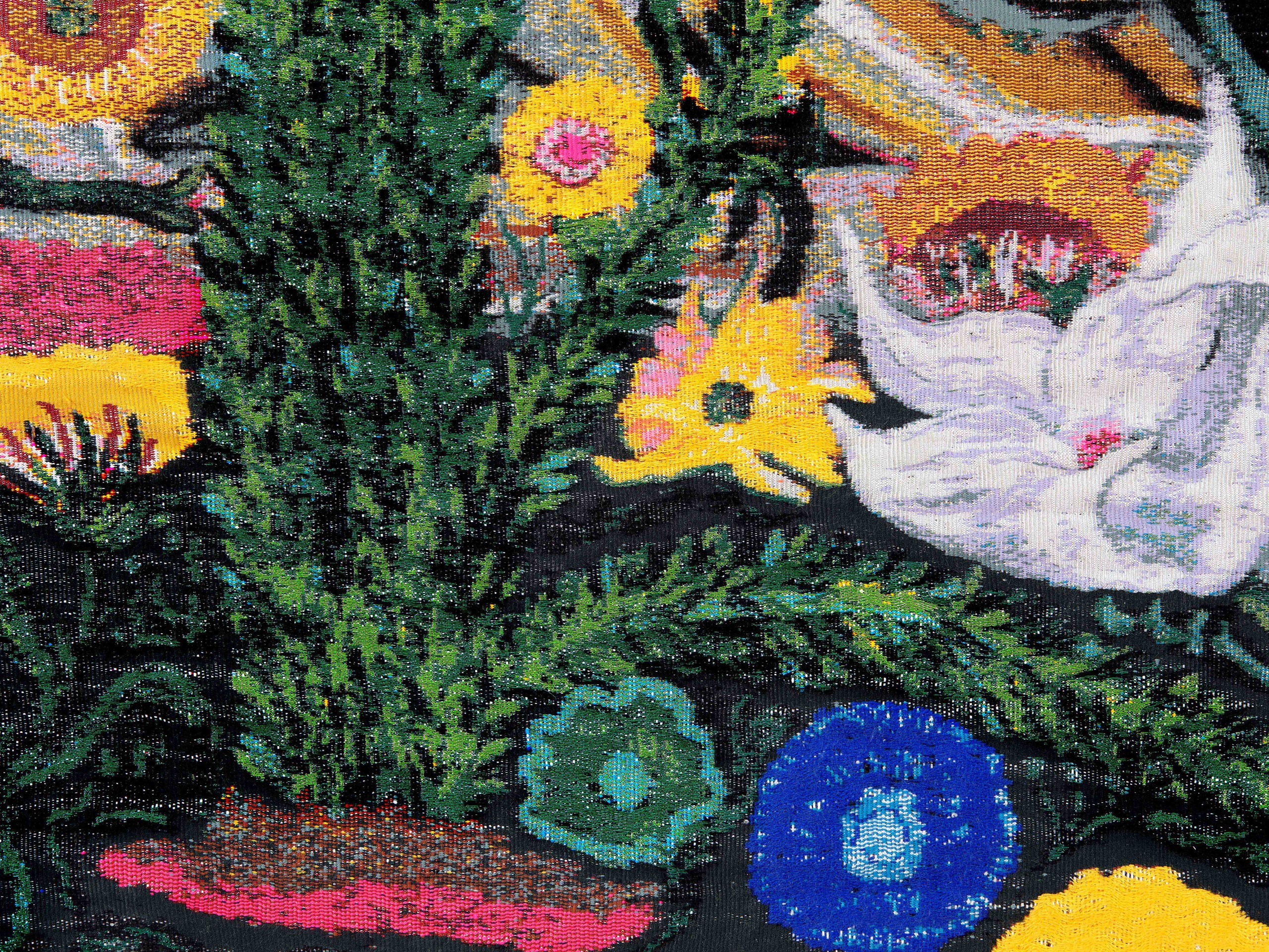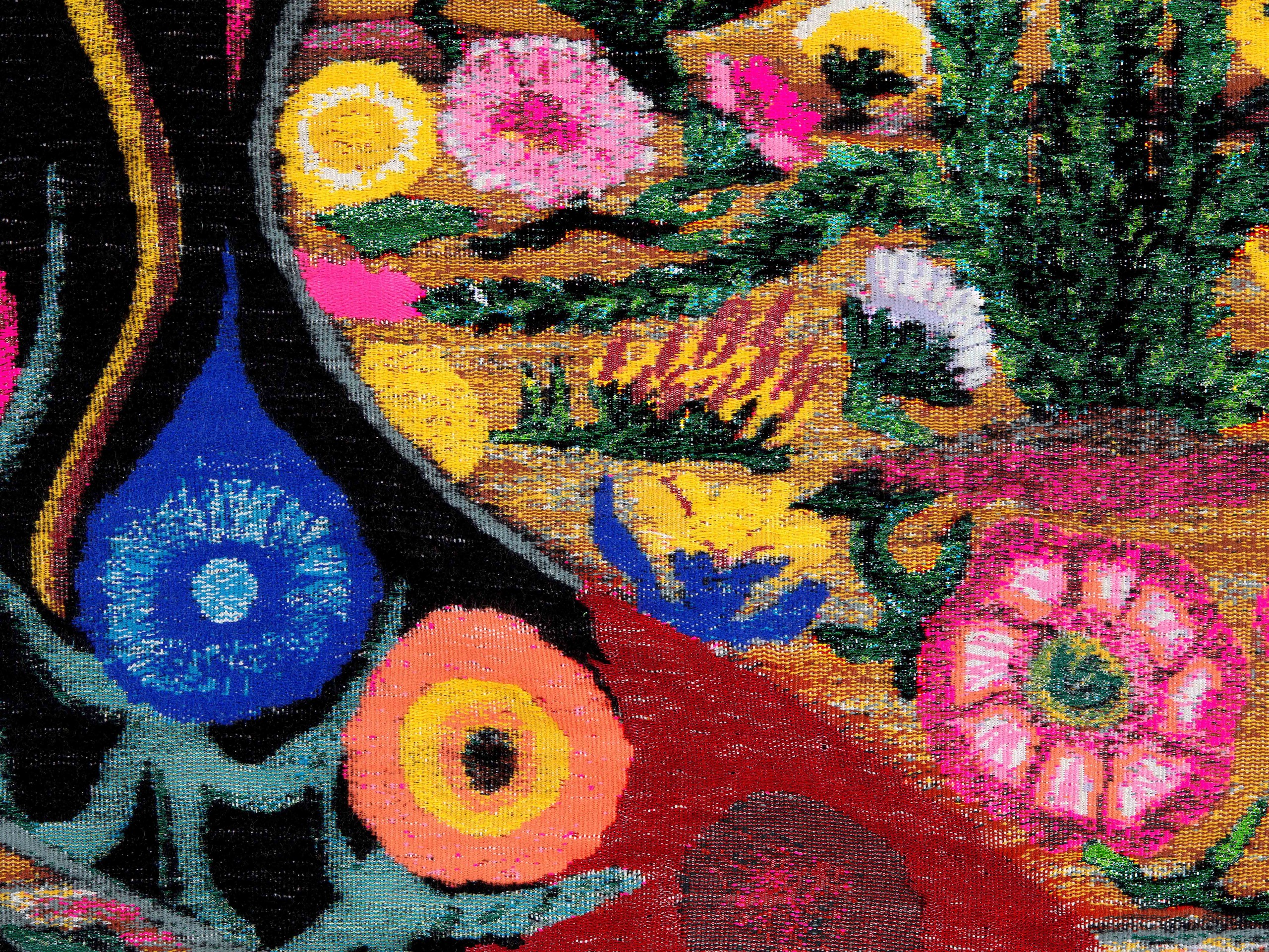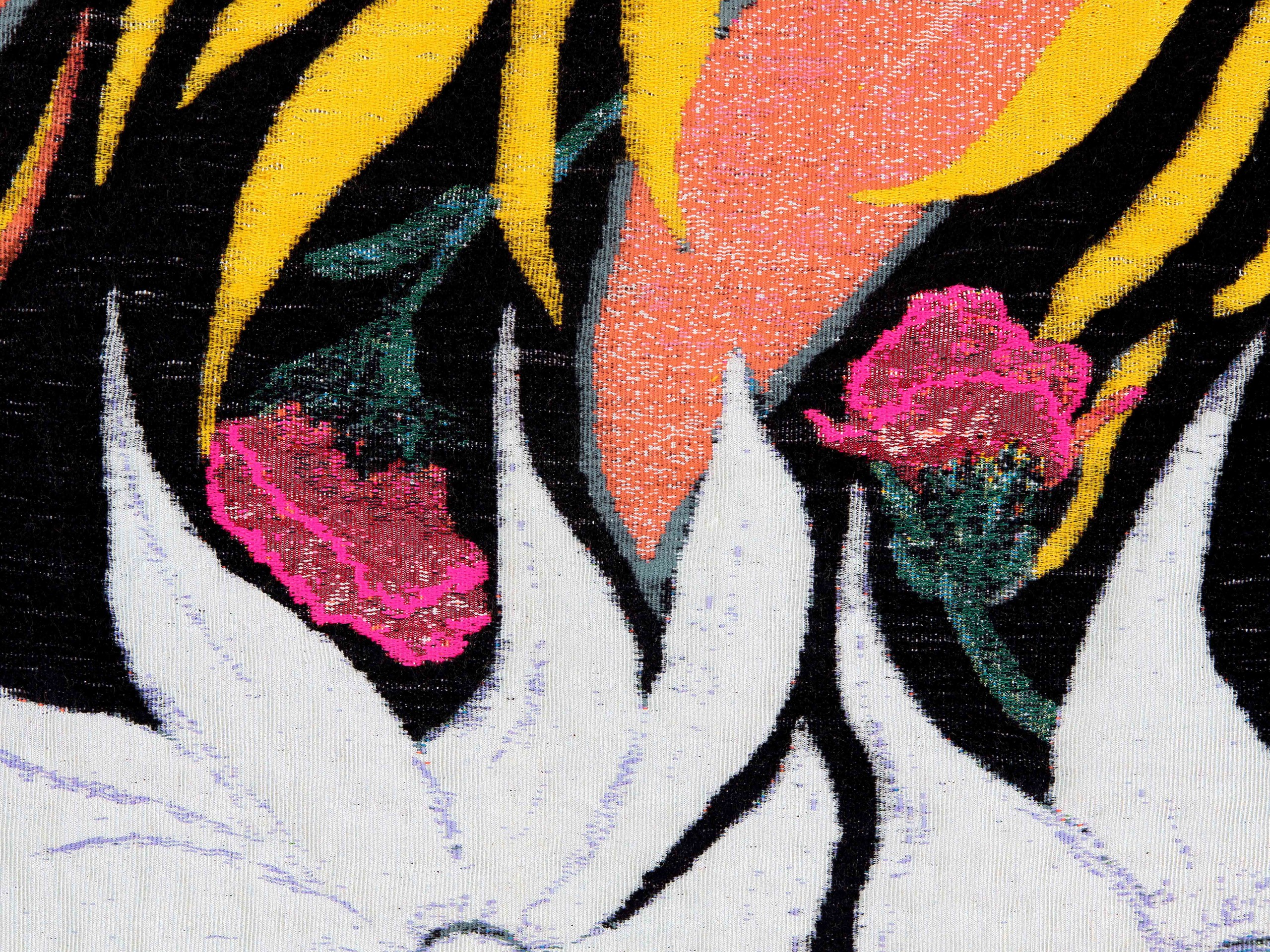Daniel Gibson chose to turn to a traditional French medium, made in Felletin, the world capital of tapestry. Full of textures and details, the motifs Gibson uses, although contemporary and culturally distant, echoes the vegetal themes used in the tapestry of yesteryear: the “Verdures”, which purpose was to escape the cold seasons by masking the windows and create new openings.