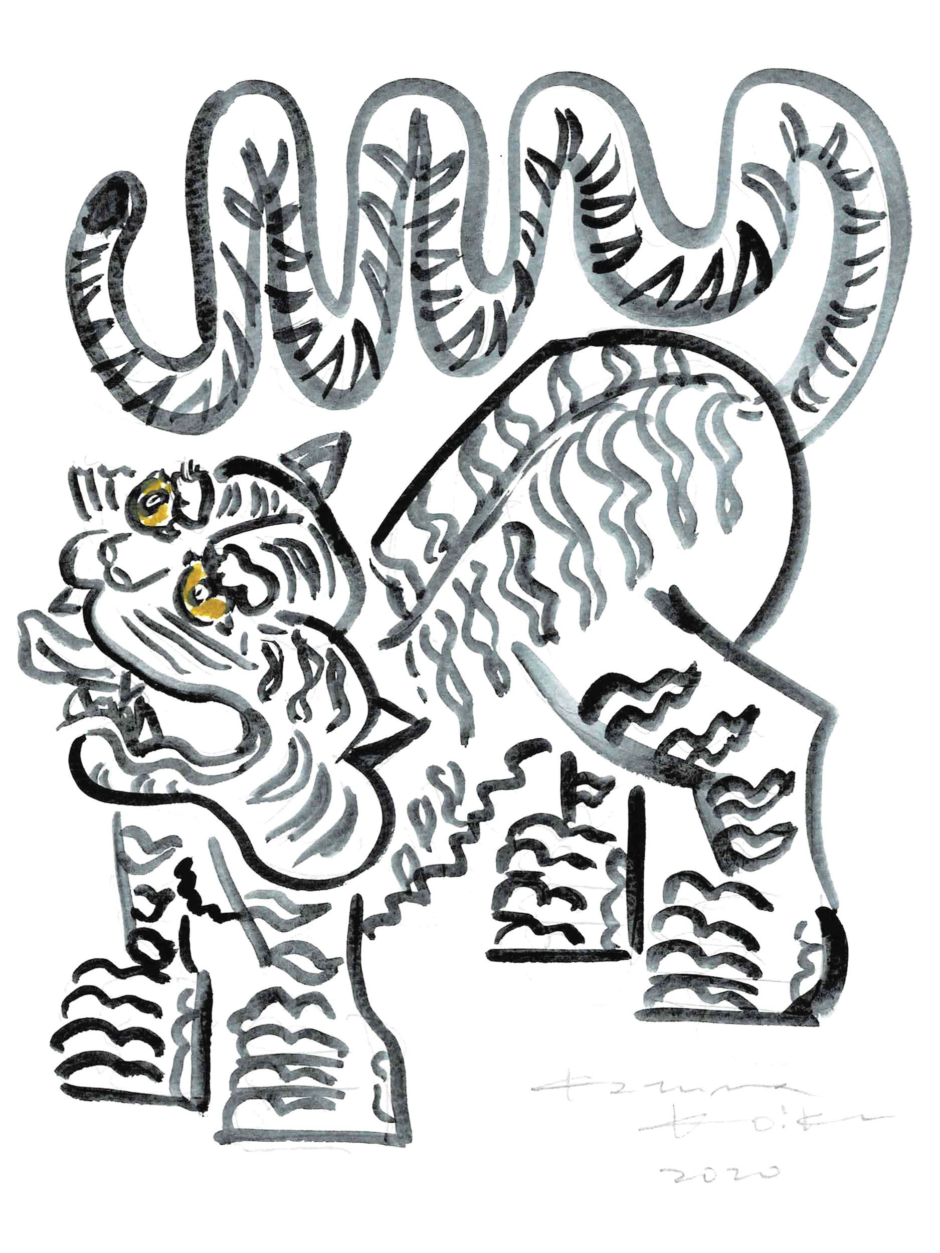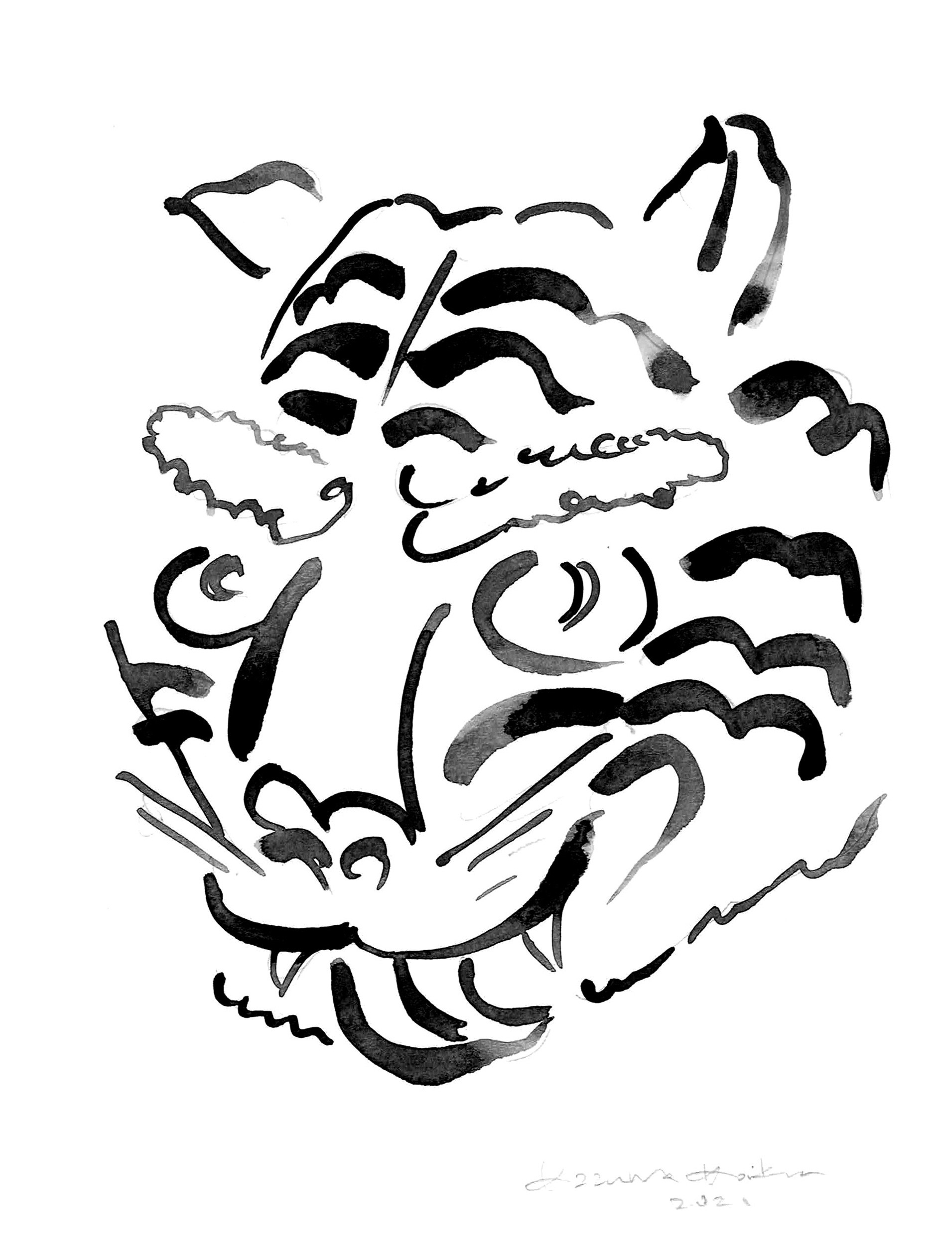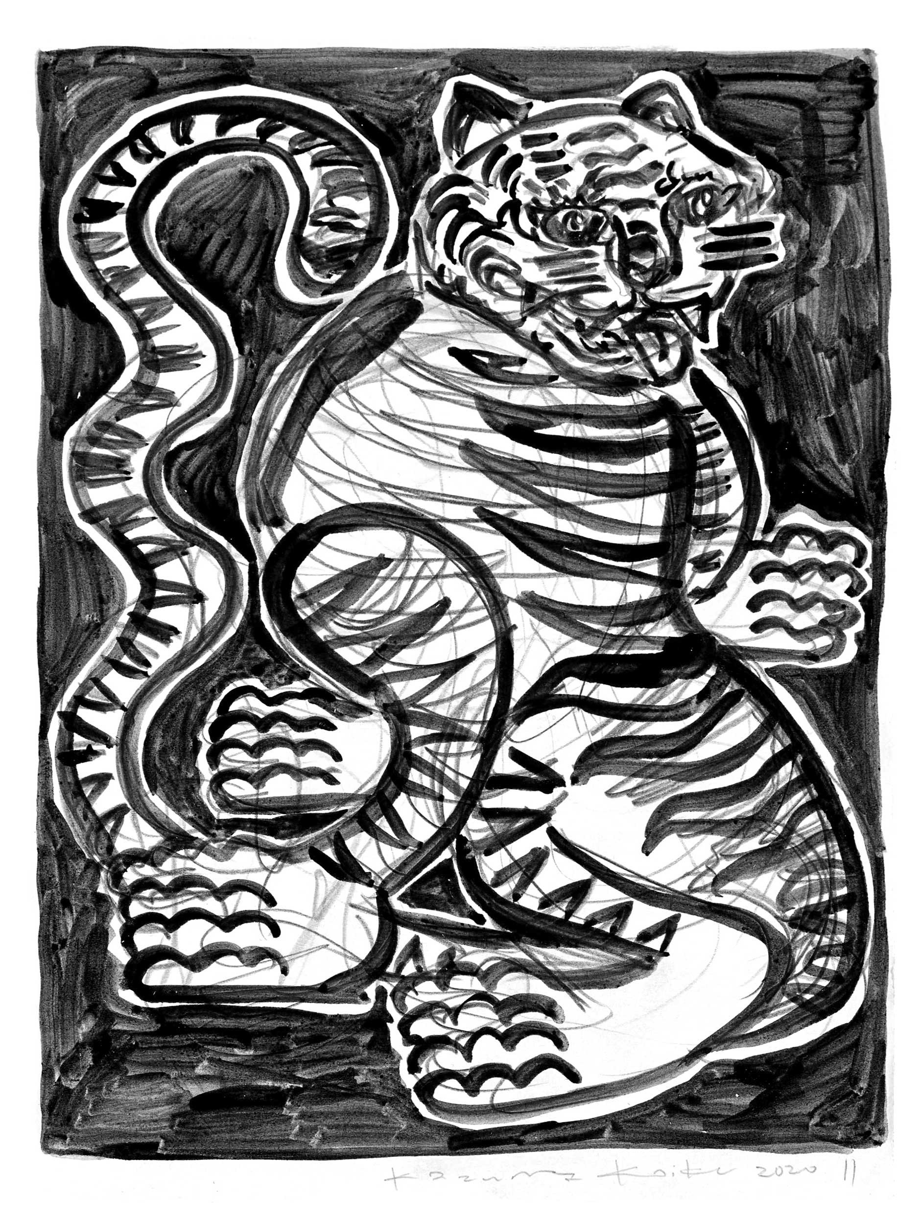 “Many painters have drawn tigers in the Edo period but there was no tiger in Japan at that time. Amazing tiger paintings of this period were made with reference to chinese paintings, furs brought back and cats. This resulted in the drawing of very special tigers as imaginary creatures. When I draw animals, I always try to make animals which do not exist. Something in between animals and gods, maybe”.