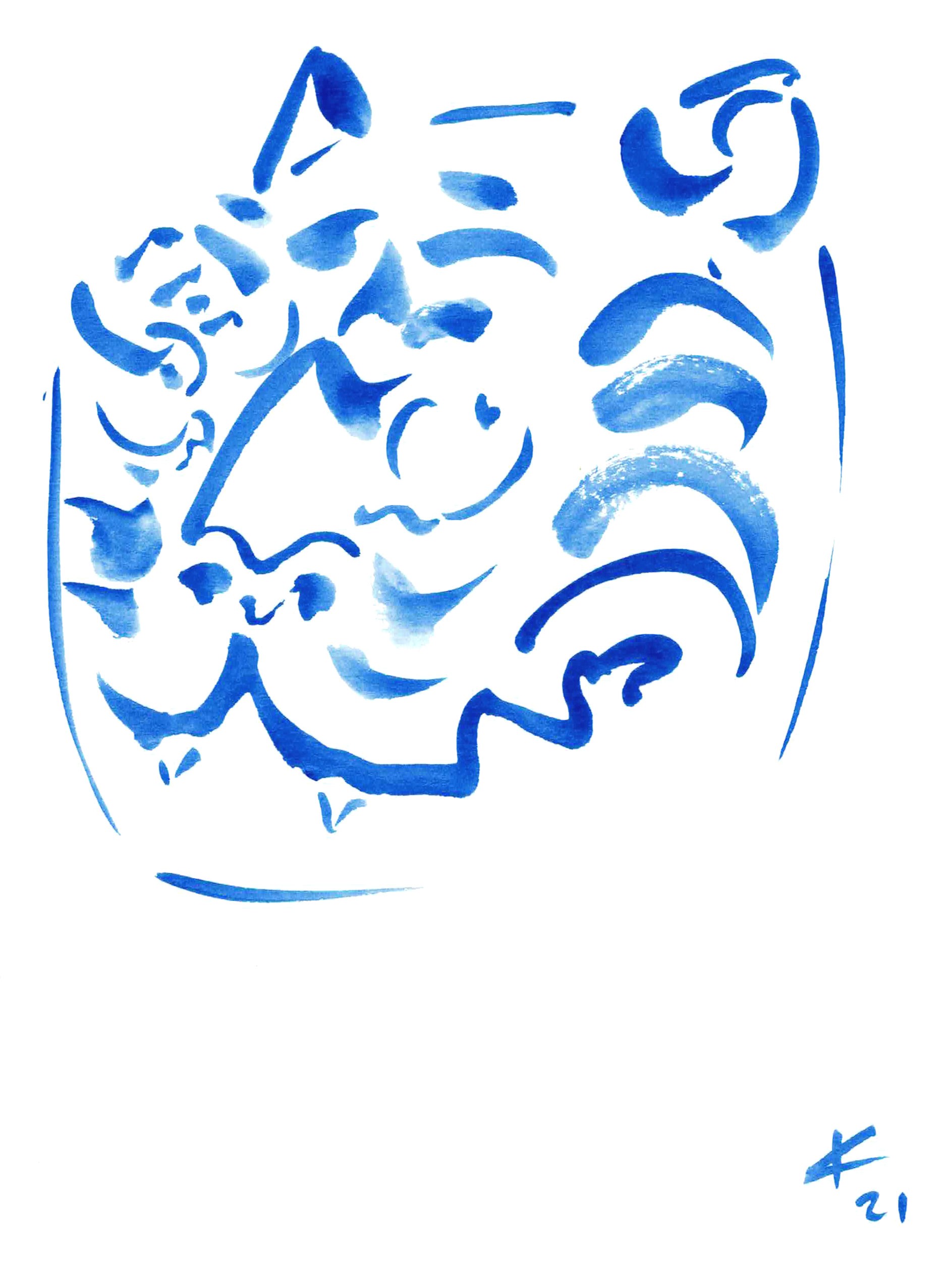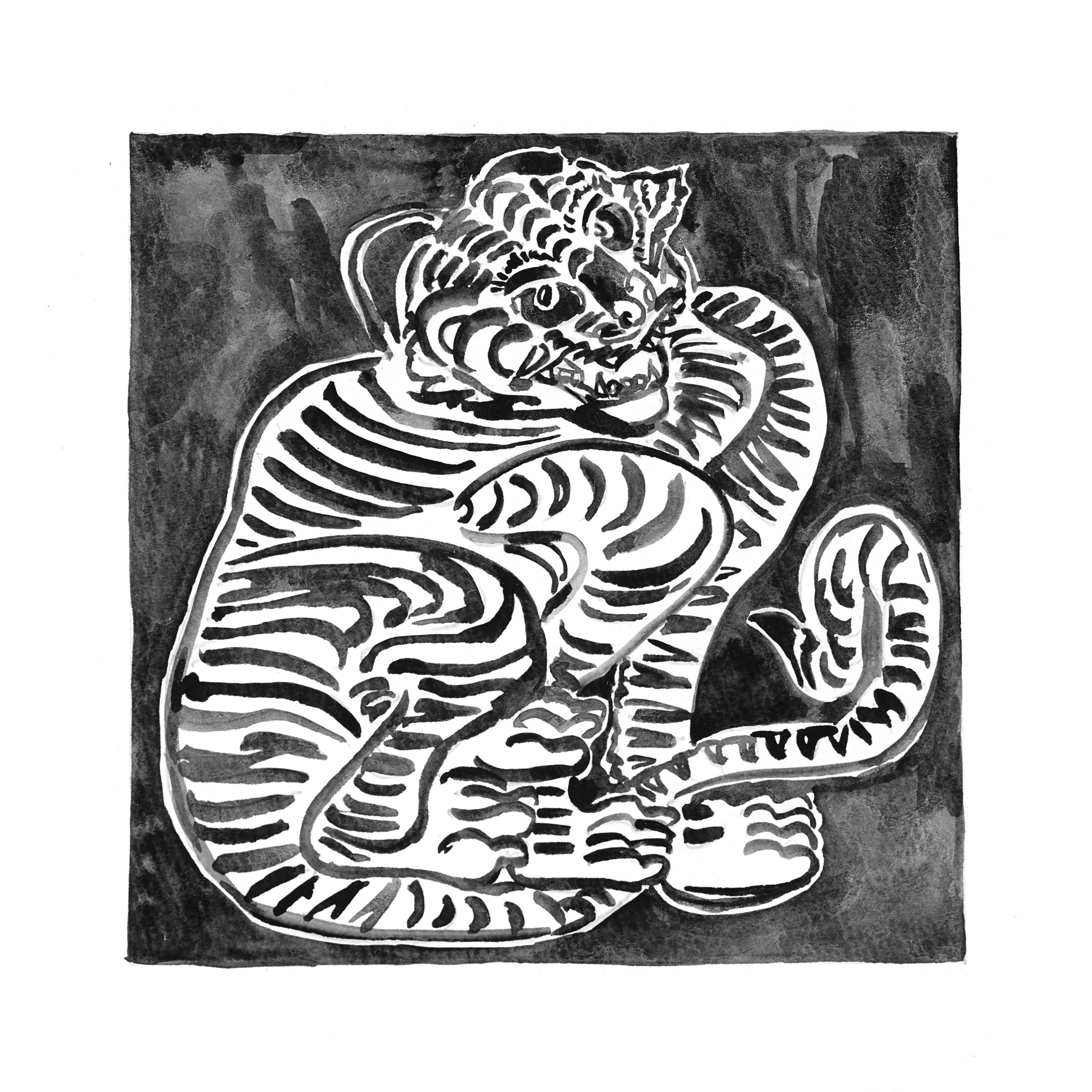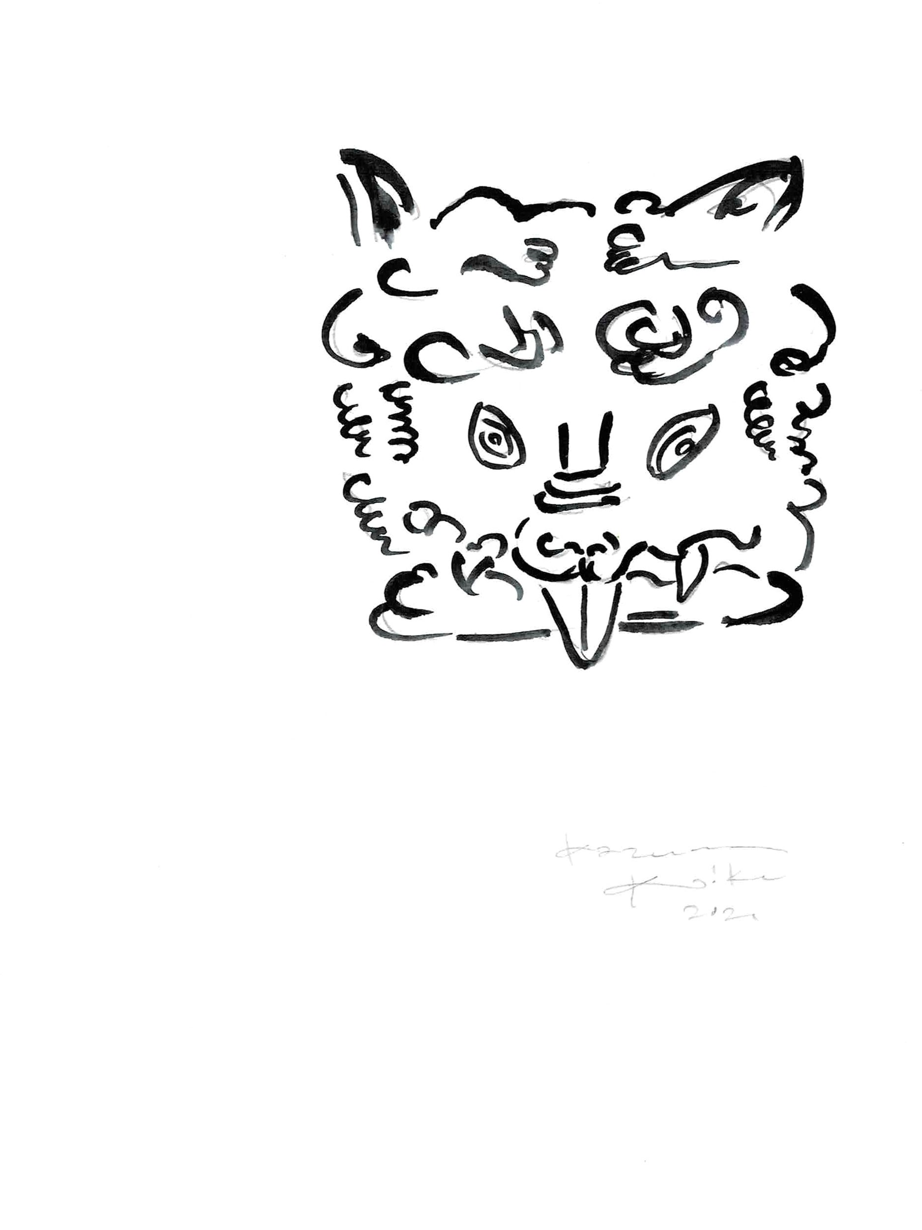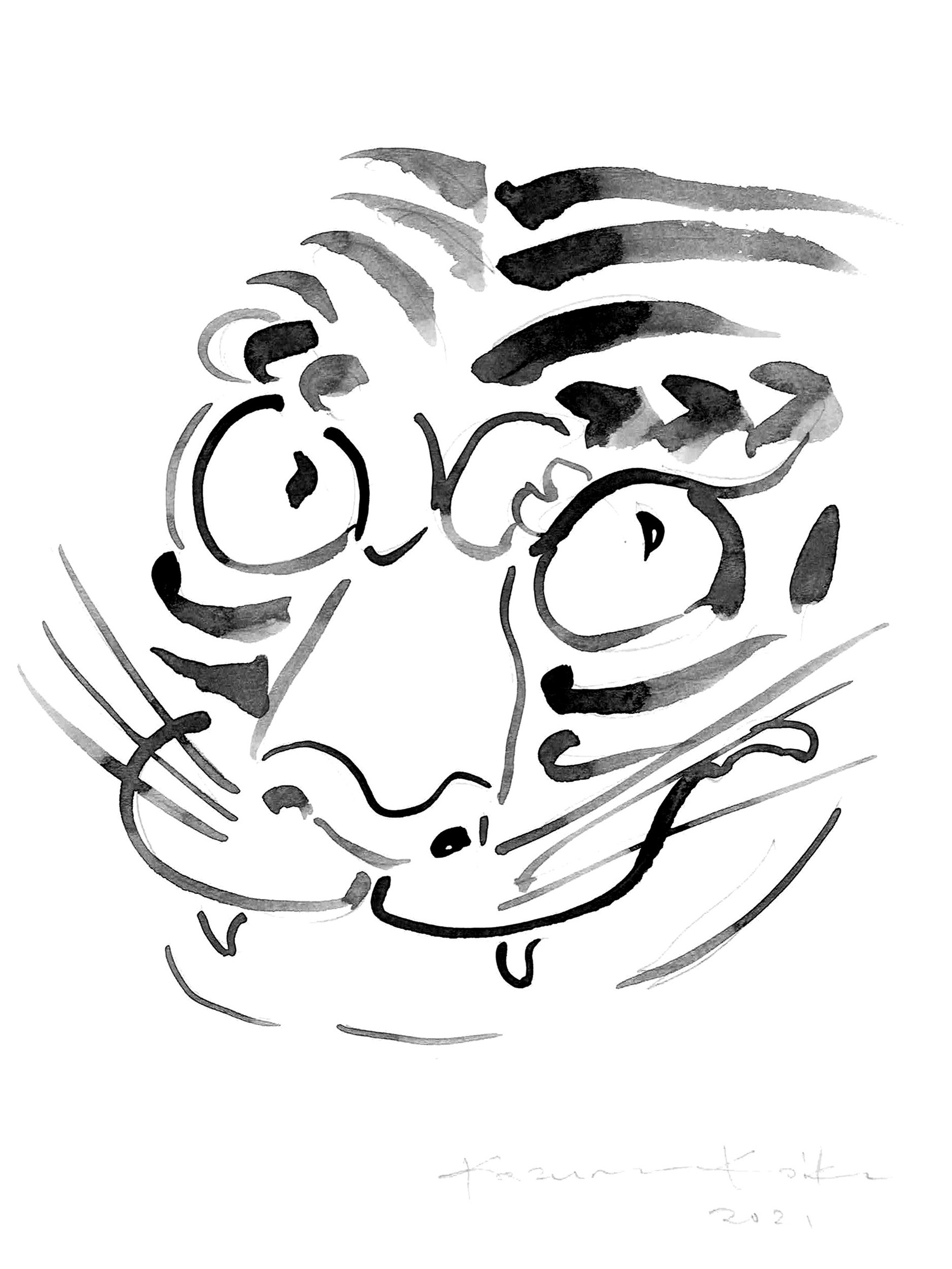 “Many painters have drawn tigers in the Edo period but there was no tiger in Japan at that time. Amazing tiger paintings of this period were made with reference to chinese paintings, furs brought back and cats. This resulted in the drawing of very special tigers as imaginary creatures. When I draw animals, I always try to make animals which do not exist. Something in between animals and gods, maybe”.
