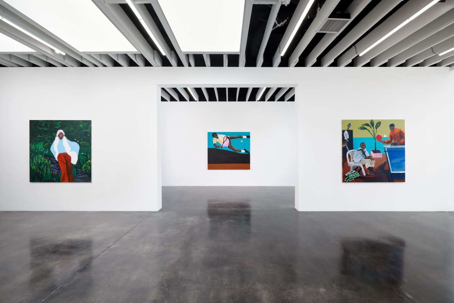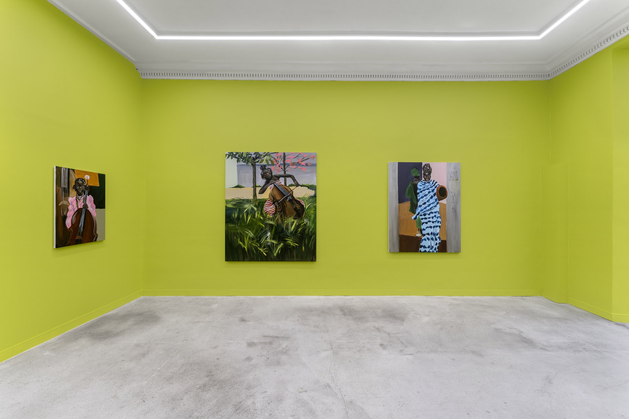 Marcus Brutus is an American artist born in Maryland in 1991. He lives and works between New York and Washington. Brutus is particularly interested in figurative art, and more specifically portraiture, which he constructs as assemblages of contemporary images and relics. Rather than a simple collage or frozen postcard, his work is an exploration of continuity, connection and transition. Marcus Brutus builds bridges between eras, suggesting moments that awaken buried or forgotten memories. The essence of his work lies at the intersection of personal memory, history, anthropology, current events, literature and popular culture. Evoking ebony marquetry, he works on faces and skins with a mastery that skilfully plays with light and shadow. His brushstrokes are broad yet imbued with subtlety, the folds of clothing are palpable and bodies seem to be in motion, dotted with touches that underline certain areas and guide the eye. For him, color is as important as the subject or narrative.