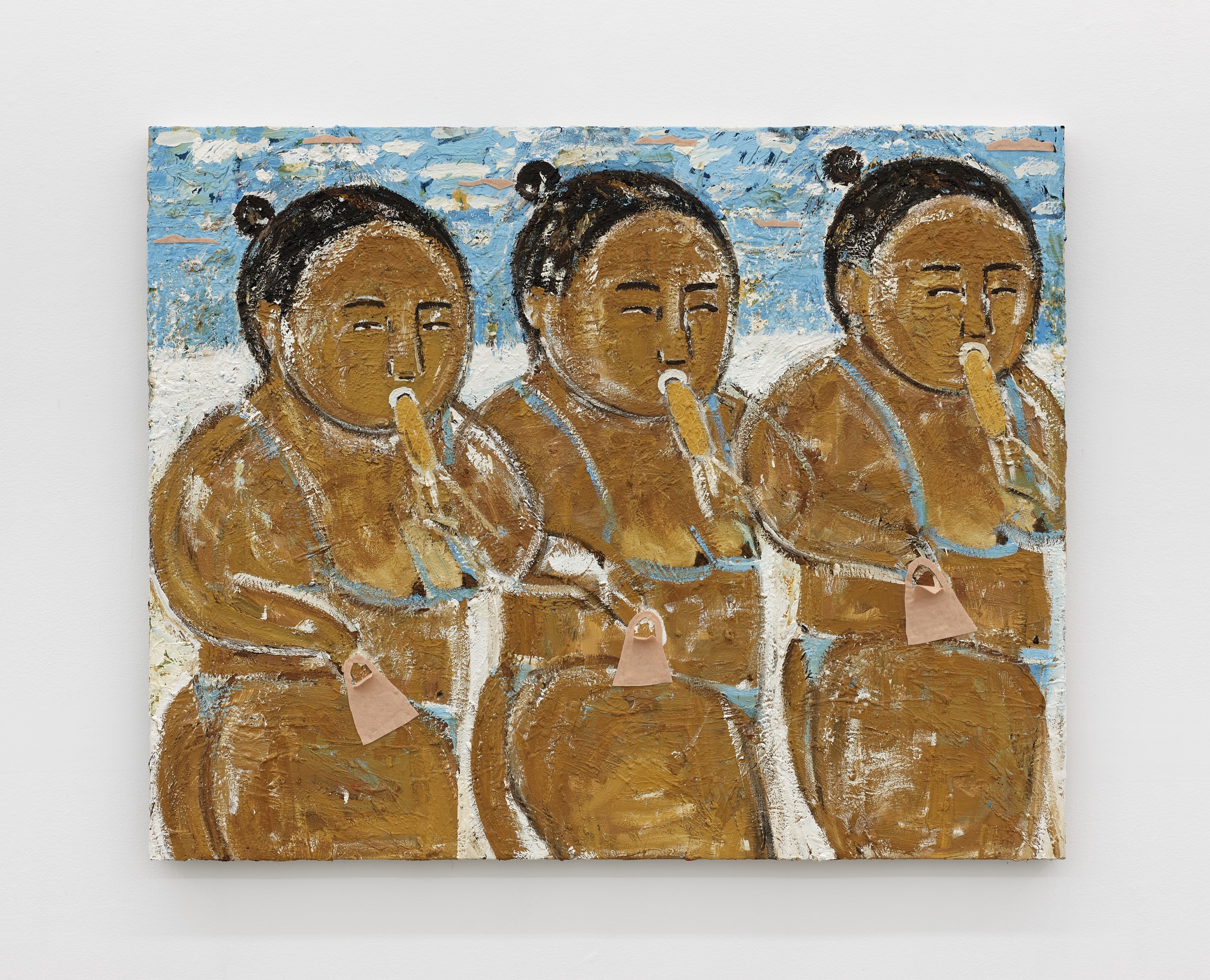 핫도그 (Corndog), 2021, Oil, acrylic, glitter, embroidery string, felt on canvas, 142.5 × 178.1 cm, ©Monica Kim Garza, courtesy of Monica Kim Garza and The Hole