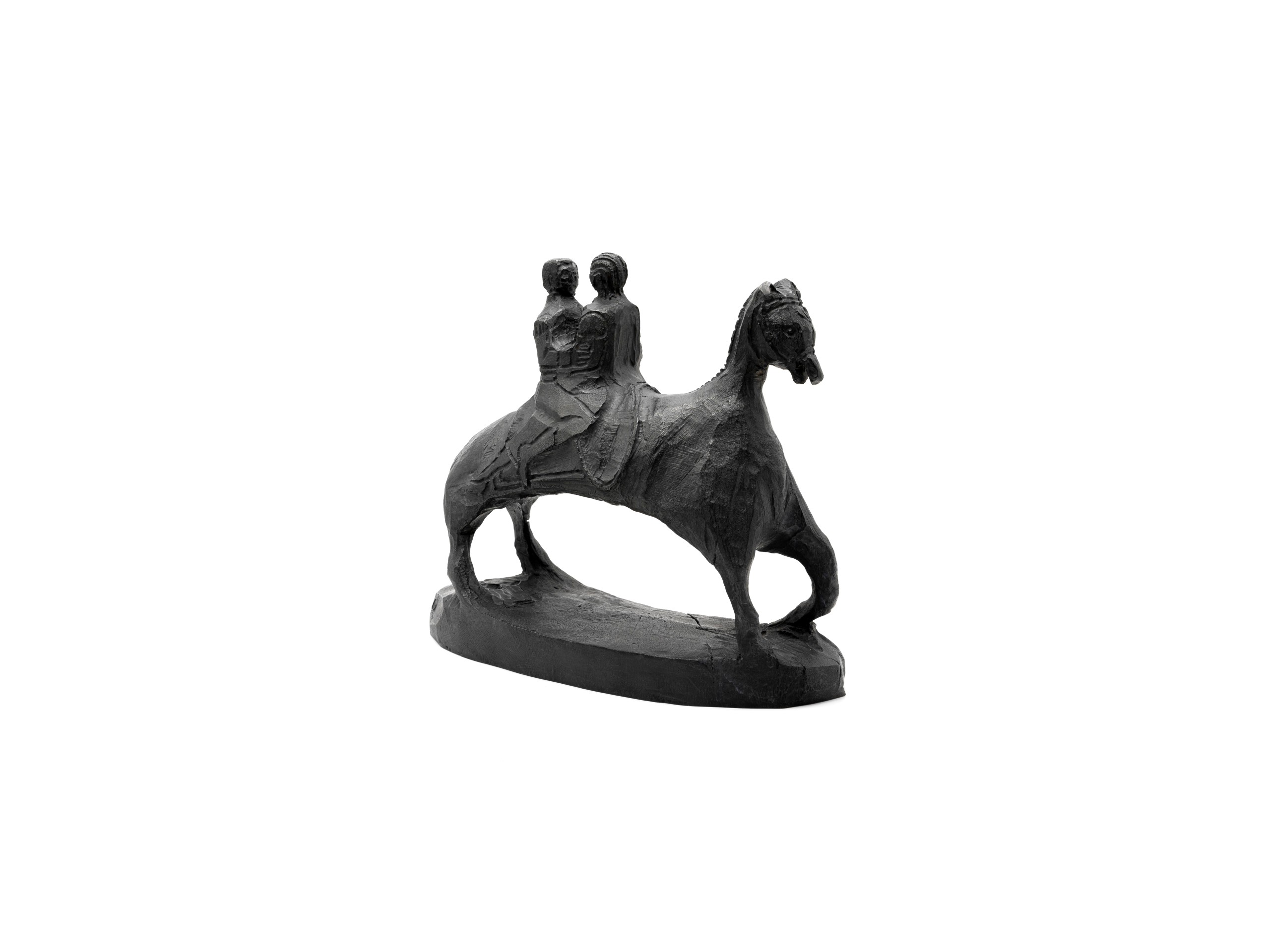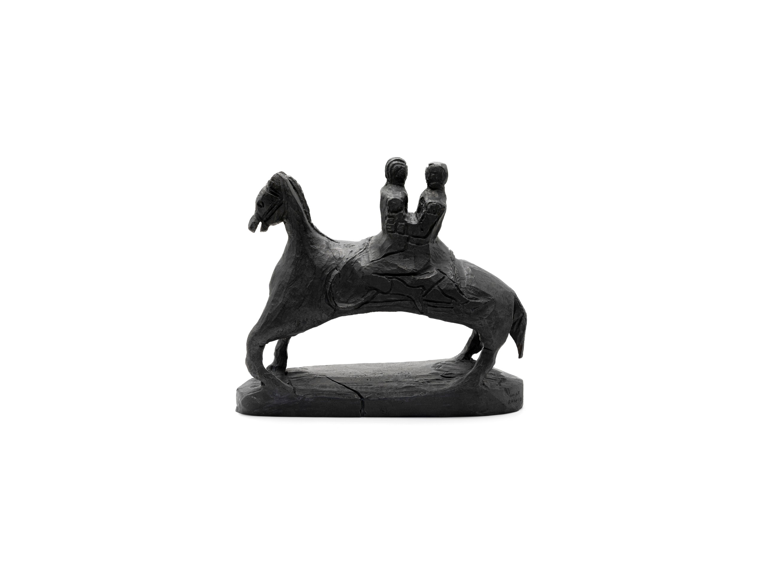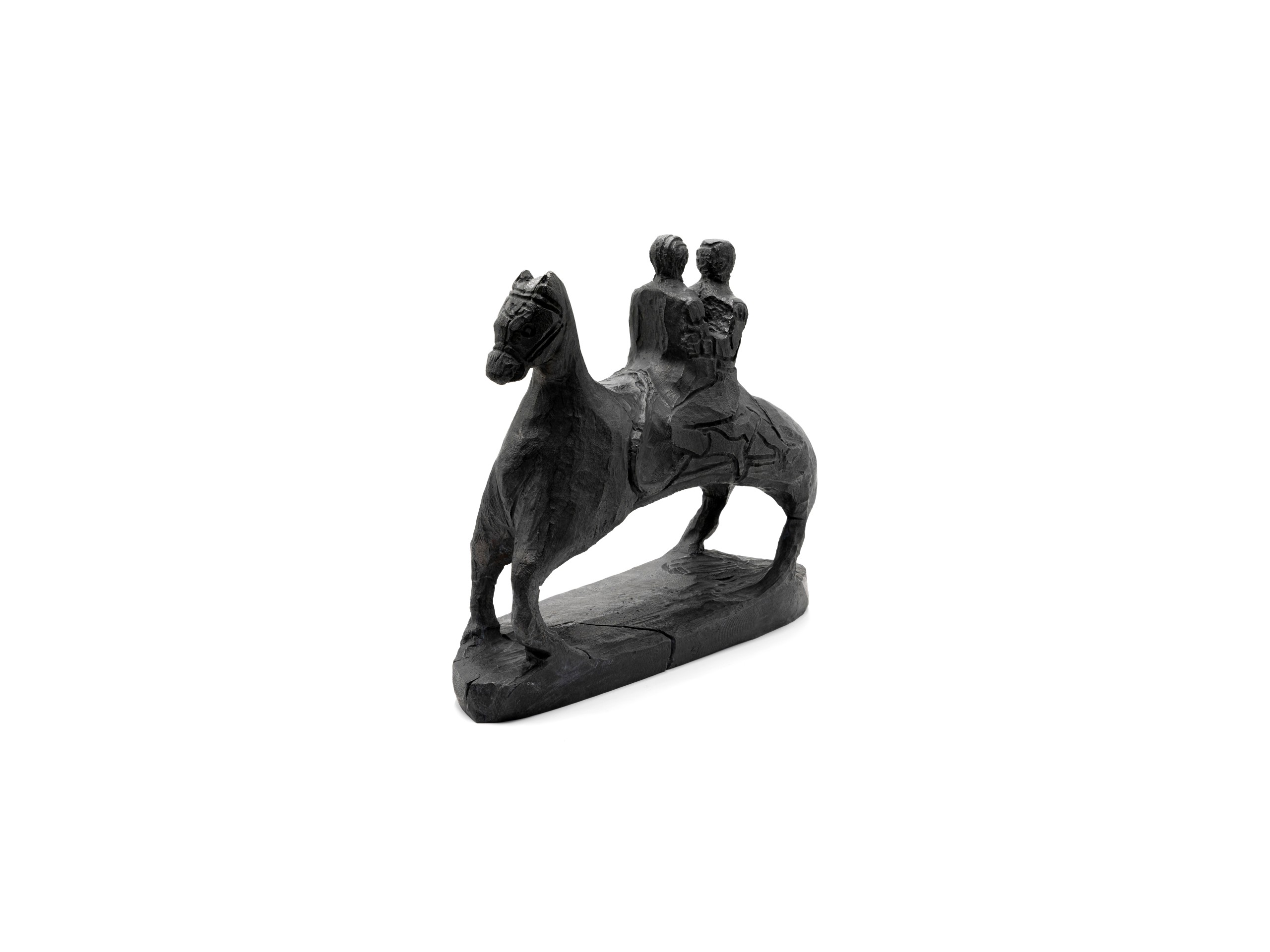 Tout en tout est un. The Power Coupling. A conduit for progress, good or bad. Or, Twoism (after Boards of Canada). The rider is a recurring symbol of these epic scenes. Here, the riding is done in duet. The sculpture, from which this work was made, was carved by Umar Rashid, extracted from a single block and worked with a gouge. The riders and the mount are then one: “Tout en tout est un”. This edition is a co-production with Droste Gallery.