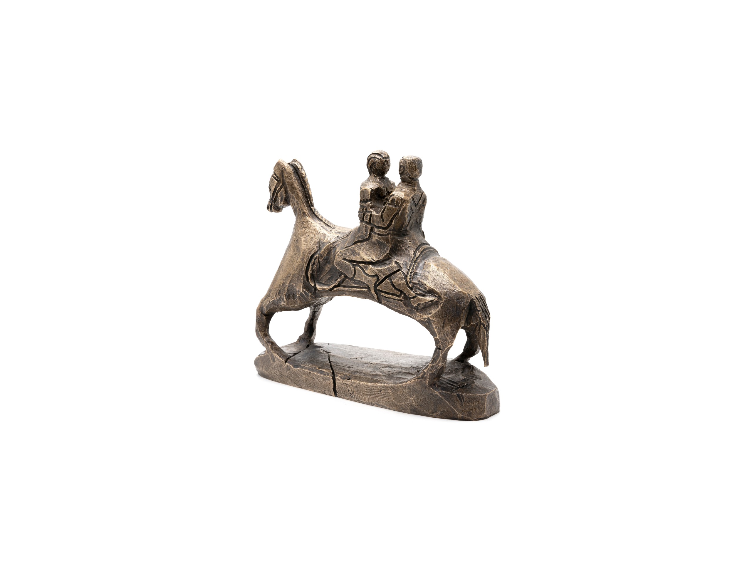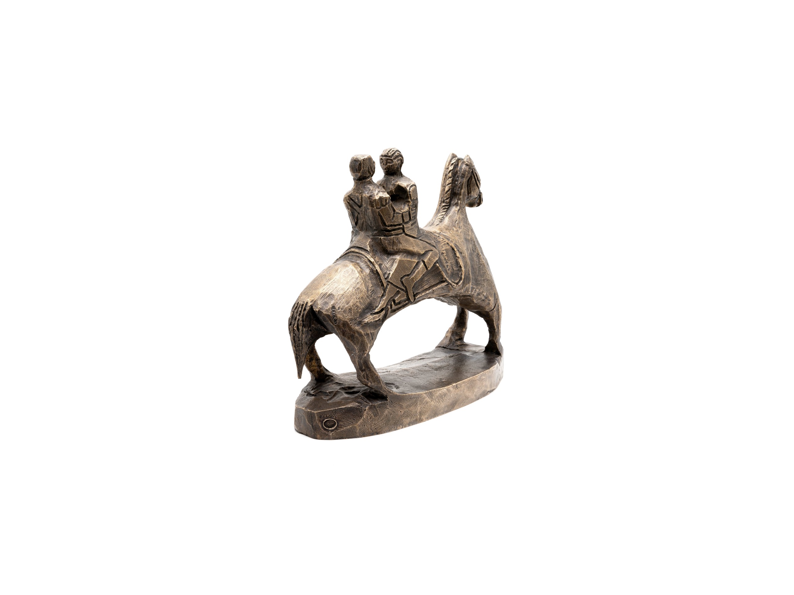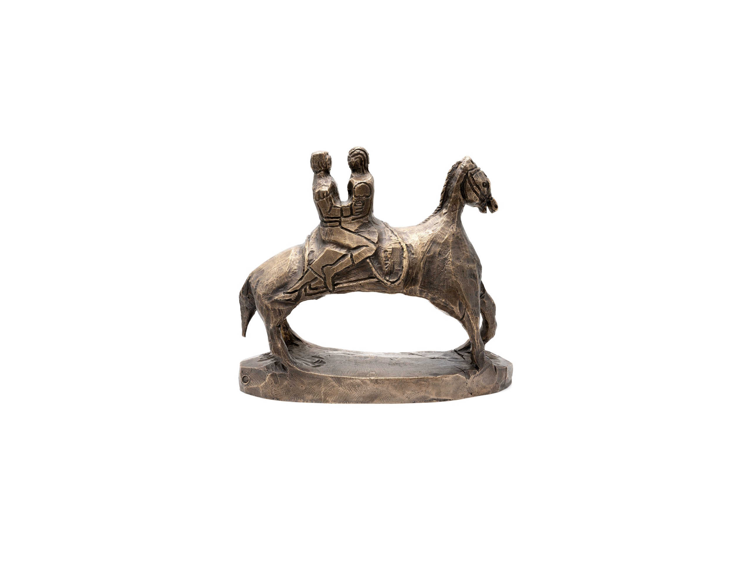 Tout en tout est un. The Power Coupling. A conduit for progress, good or bad. Or, Twoism (after Boards of Canada). The rider is a recurring symbol of these epic scenes. Here, the riding is done in duet. The sculpture, from which this work was made, was carved by Umar Rashid, extracted from a single block and worked with a gouge. The riders and the mount are then one: “Tout en tout est un”. This edition is a co-production with Droste Gallery.